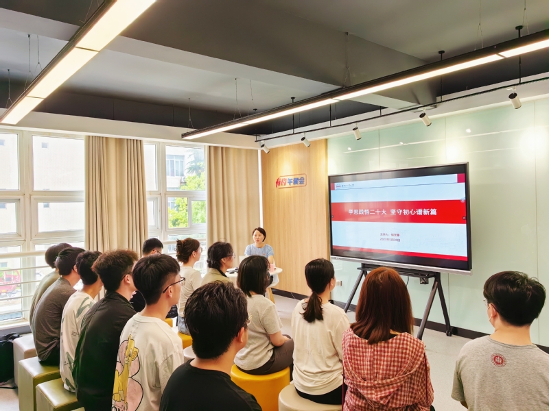5月30日上午,beat365中文官方网站党委副书记储文静以“学思践悟二十大,坚守初心谱新篇”为题,在翡翠湖校区2号学生社区沙龙空间为学院学生第一党支部作专题党课。