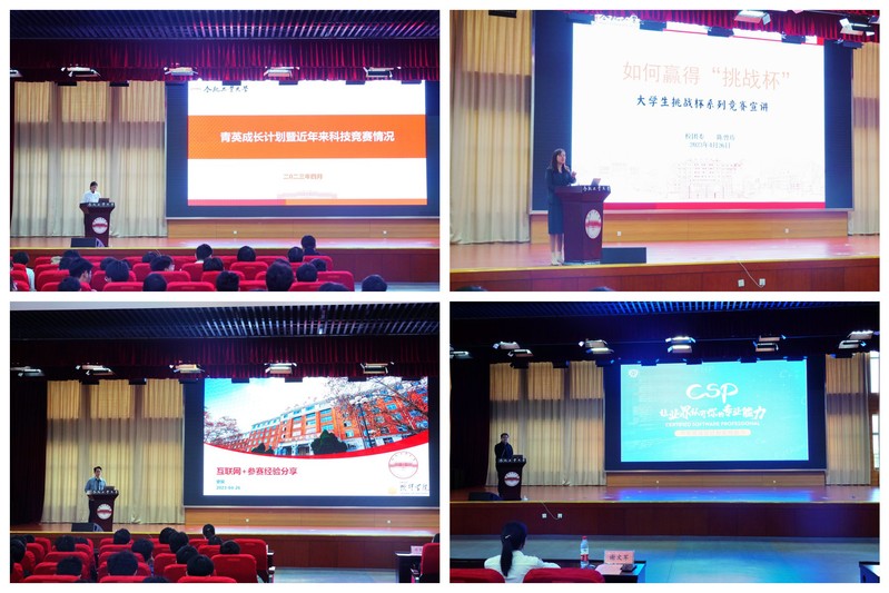 表彰大会之后,在“青英成长计划”启动仪式上,郑华介绍了beat365中文官方网站“青英成长计划”暨近年来科技竞赛情况。校团委创新发展部部长陈曾珍宣读《关于表彰beat365中文官方网站首届“科创之星”的决定》,与会领导共同为首届“科创之星”获奖者颁奖。随后,陈曾珍老师、互联网+国家银奖指导老师史骏、学院CCF-CCSP负责老师谢文军分别围绕“挑战杯”“互联网+”“CCF-CCSP”赛事向同学们做了详细解读,2019级学生罗廷辉、祝新宇两位同学分享了他们的备赛之旅和比赛感悟。