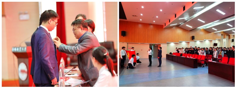 会议举行了隆重的入团仪式和颁奖仪式。邢松宣读了新入团学生名单,与会领导为新团员颁发了团章并佩戴团徽。学生会主席团成员夏思敏带领新老团员进行庄严宣誓。2019级祝新宇同学作为院“优秀青年标兵”代表发言。