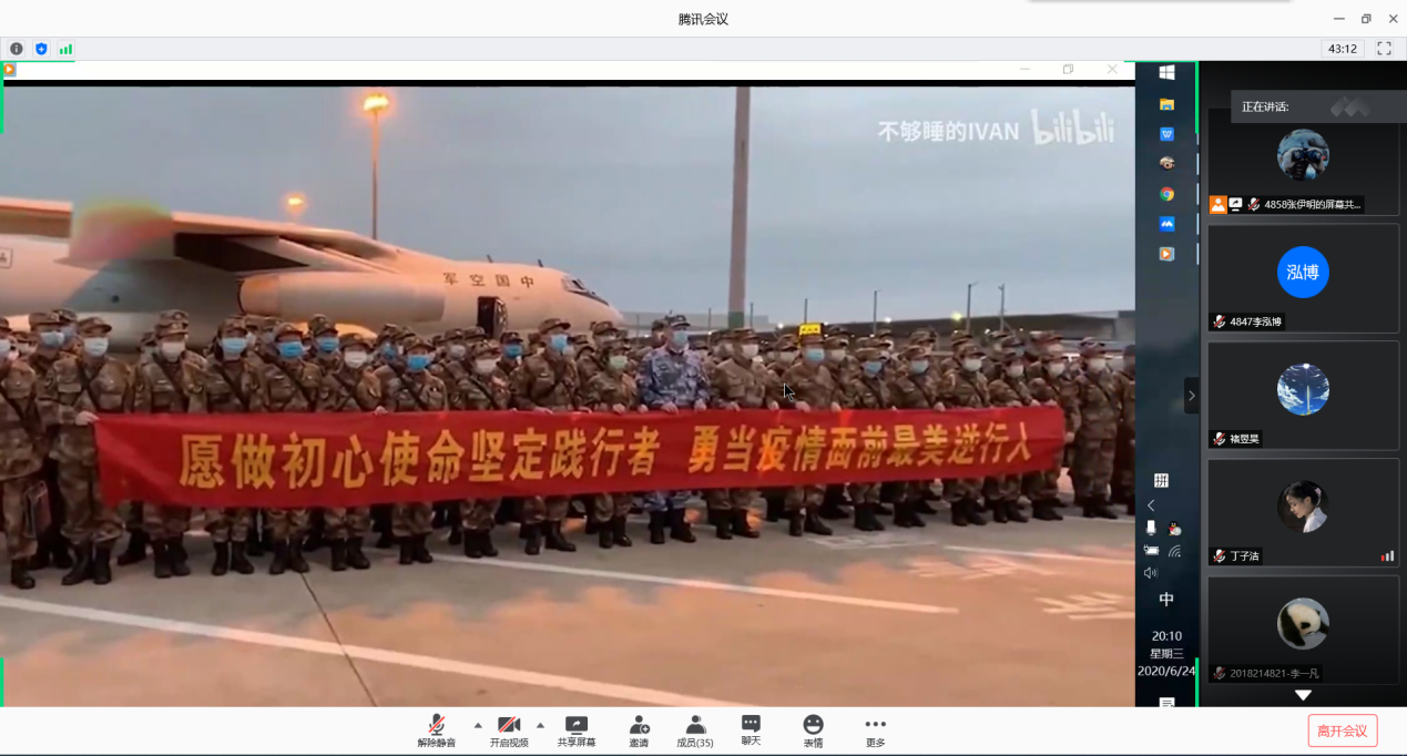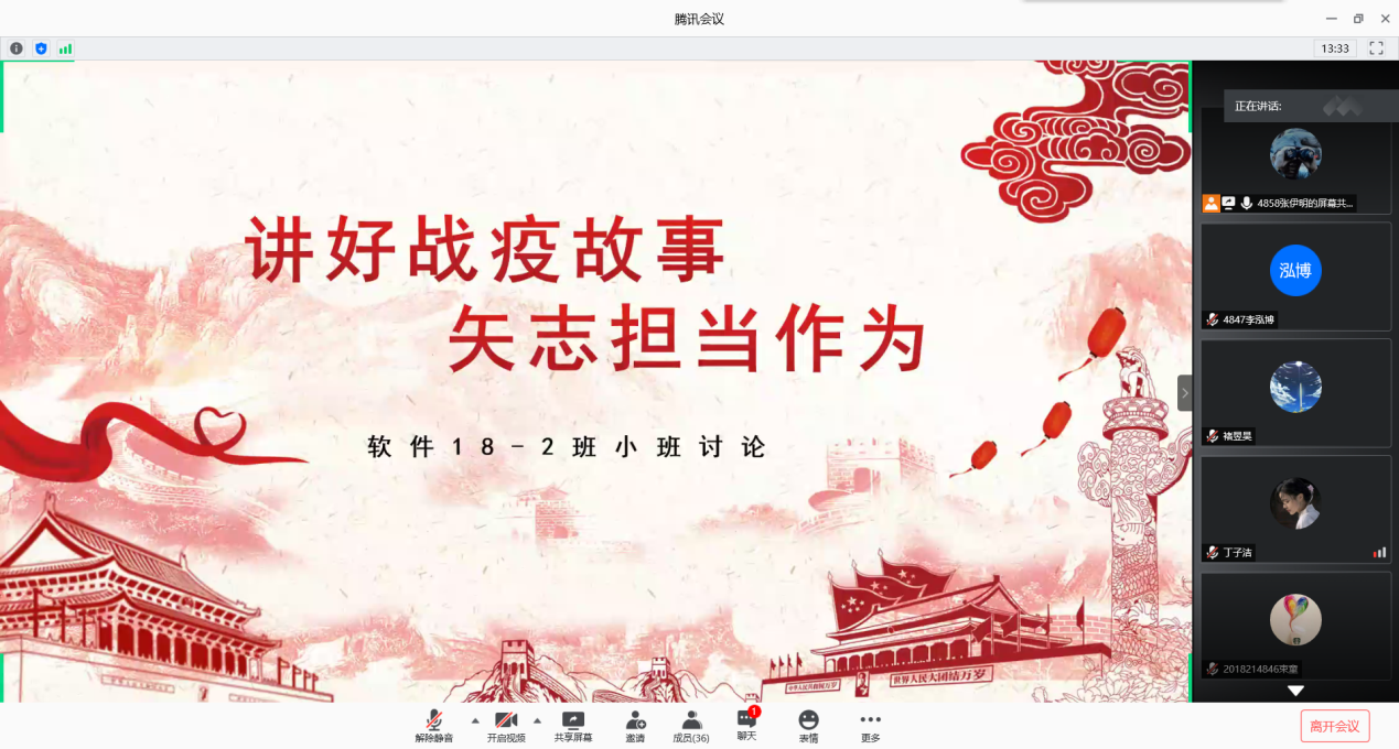 牢记责任使命,矢志担当作为。与会同学对战役故事进行积极的讨论发言,发表自己的感悟。18-1班团支书蒋雁南同学说:“从分享的战疫故事中,我体会到人物精神,感受到了中国精神,要从中汲取力量,寻源奋斗方向,为疫情阻击战和国家建设贡献了自己的一份力量。”18-1班团支书程琳同学说:“疫情尚未结束,各位同学要注意外出安全带好口罩。要相信国家,要相信政府,只要全国14亿人民上下一心、众志成城、同舟共济,我们一定可以打赢这场疫情防控战。”