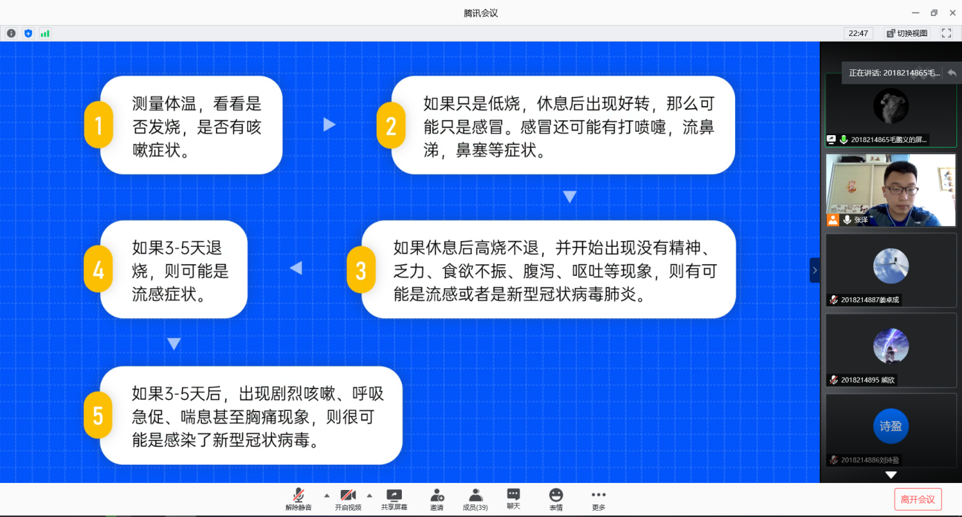 实际案例分享,强化思想认识。班长从“假如不幸生病,我们应如何应对? ”和“送医院前,我们应该先问自己几个问题”实际的问题出发,引起同学们的思考。并通过分享疫情防控“先行者”不畏艰险、冲锋在前、舍生忘死的动人故事,引导同学们厚植爱国情怀,认识自身使命,强化思想认识,为疫情防控做出自己的贡献。