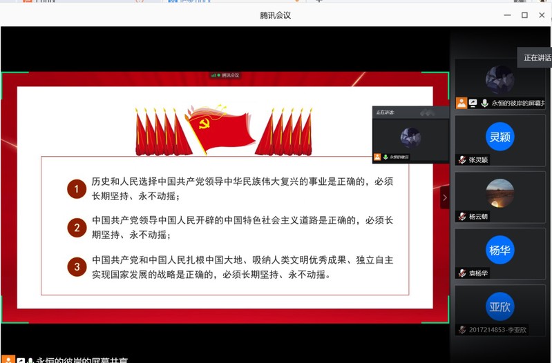 支部组织委员唐涵首先从党史的发展脉络、党的历史给我们的启示、党的历史贡献三个方面与大家一起重温了中国共产党的发展历程,并带领大家一起观看了教学视频《风华正茂》。随后,党支部每位党员结合疫情期间自身的经历,讲述了身边的感人战疫故事,分享成长感悟。有的同学讲述了母亲作为一名共产党员和社区工作者连续两个月无休奋战在抗疫第一线的故事;有的同学分享了身边亲人奔赴武汉抗击疫情的故事;有的同学分享了家乡派出所一位民警在疫情中奋斗直至献出生命的故事……一个个鲜活的事例,让每一个坐在屏幕前的党员学生深受鼓舞,他们切身感受到危难时刻党员挺身而出的力量,体会到一个党员就是一面旗帜的真正内涵,充分认识到正是党的正确领导,无数党员的辛苦付出,全国民众的团结一致才取得抗击疫情的阶段性胜利。