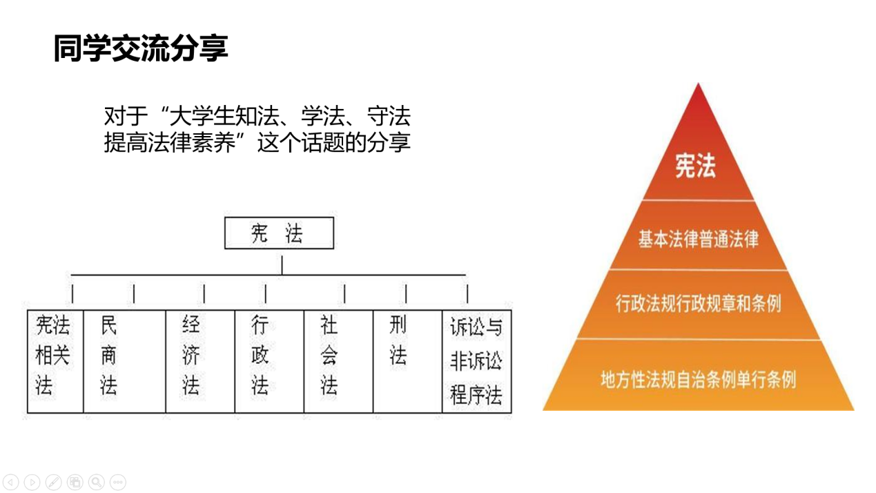 主持人讲述后,同学们也围绕“大学生学法、知法、守法 提高法律素养”这一话题展开了踊跃的讨论。一些同学们论述了自己对于大学生法律意识欠缺的问题原因的看法以及提出了解决方法,还有同学举了身边的相关案例,希望大家了解一些法律知识以维护自身合法权益,也有同学给大家推荐了厚大法考的讲述法律知识的老师的视频,呼吁同学们观看视频,扩大自己的法律知识储备。大家的积极发言引起了全班同学的很多思考,明晰了我们公民要做到享有权利和履行义务相一致的观点。