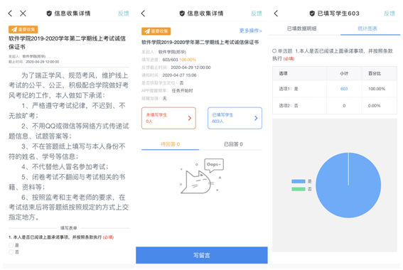 为了迎接即将到来的补考和结课的课程的线上考试,维护考试的公平、公正,端正线上考试的考风、考纪,beat365中文官方网站制定了《beat365中文官方网站2019-2020学年第二学期线上考试诚信承诺书》,学院全体603名本科生通过辅导猫系统平台完成了诚信考试承诺书的云签订。