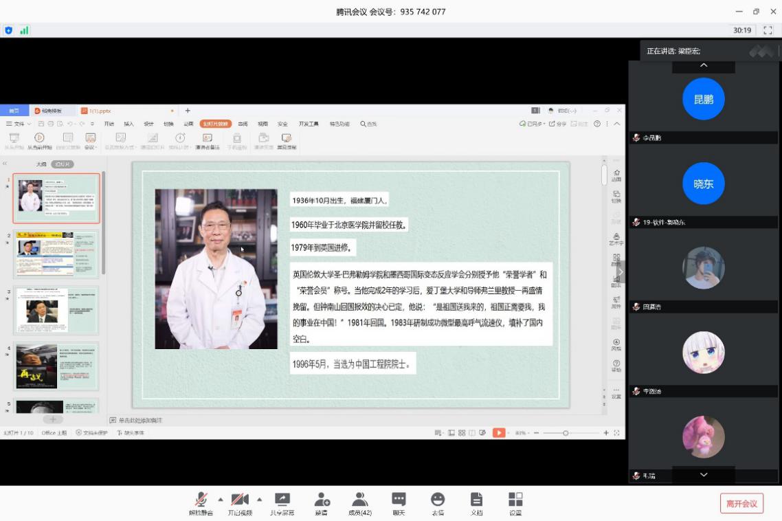 这次小班辅导同上次团日活动一样,同样采取线上形式,不同的是同学们可以更熟练的运用电脑工具进行汇报总结。在段林晨的报告中,主要涵盖了四大主要内容:1.坚定理想信念,凝聚思想意识;2.弘扬爱国主义,厚植家国情怀;3.讲好战役故事,矢志担当作为;4.深化劳动教育,促进全面发展。段林晨同学指出了中国的生命大于金钱的重要思想,在治疗新型冠状病毒的巨大资金支出。同时将中国对于处在国外的中国人员的援助与一些其他国家对海外本国人员的援助进行对比,具体真切地体现了中国社会主义制度的优越性。活动当中,各位同学积极参与,表达自己的看法。商格菲同学表达了新时代新青年的大无畏精神,在抗疫活动中冲锋陷阵;之后,梁臣宏和罗庭辉同学均对抗议名将钟南山作出介绍与分析,教育同学们要向钟老学习;李激扬同学又就读书与自身建设做出一系列叙述,表达了希望同学们不能完全功利的读书,要享受读书。