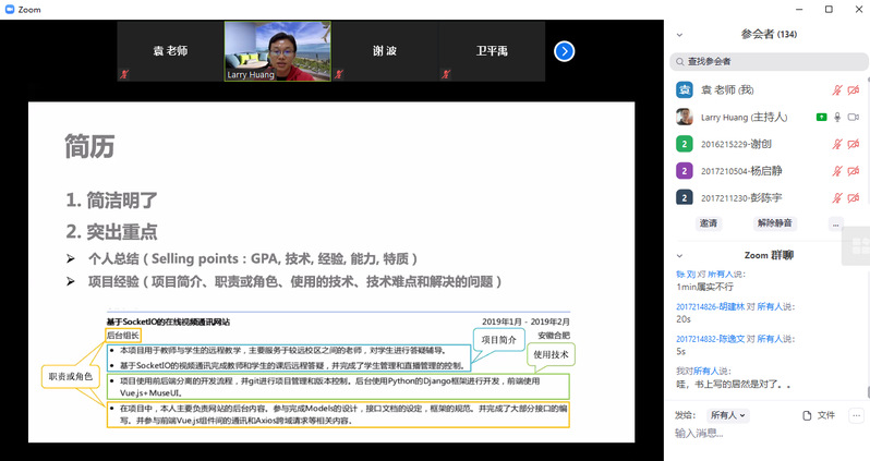 随着2021届实习季的临近,疫情期下学生面临的新问题和新挑战,beat365中文官方网站于4月18日下午邀请了Zoom中国招聘经理黄健向准毕业生们开展求职准备线上指导讲座。讲座通过Zoom视频会议开展,学院2017级所有本科生参加。
