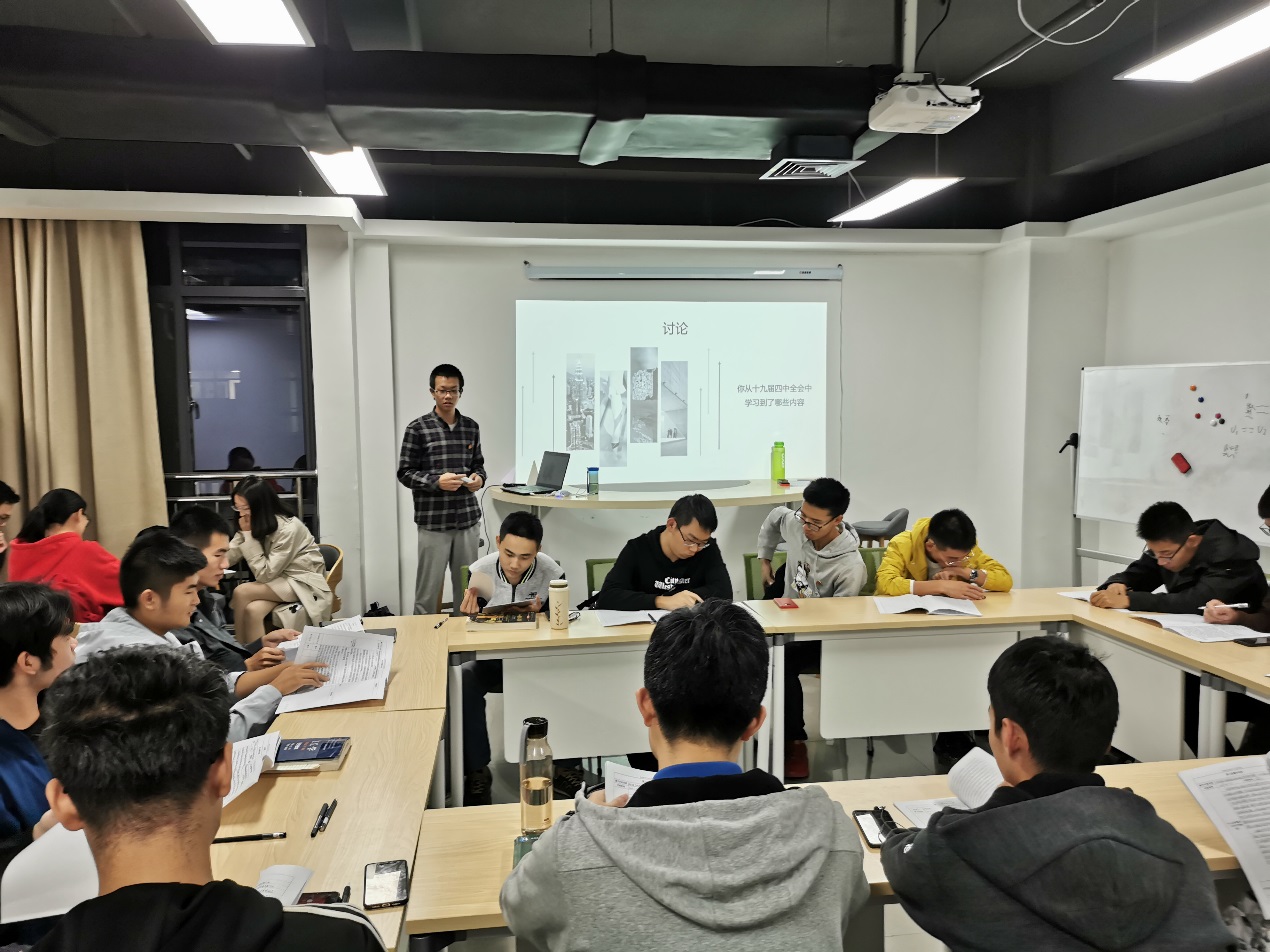 为深刻把握党的十九届四中全会的重大意义和核心要义,学习领会、全面把握党的十九届四中全会的精神实质和科学内涵,2019年11月5日晚上学院青马班学员在科教楼B座910室召开讨论会。会议以学习党的第十九届四中全会会议精神为主题,并结合全会系列讲话内容,激励同学们牢记党的初心和使命,自觉砥砺成长,担当时代使命。