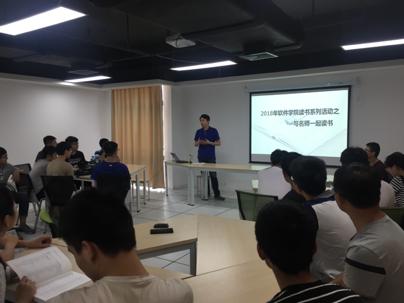 与会的同学自发地分成六个小组,在事先阅读的基础上,每组由一个代表进行阅读分享《Just for Fun: The Story of an Accidental Revolutionary》、《计算机文化》、《浪潮之巅》,每位分享者都结合幻灯片进行简短的分析和提问。