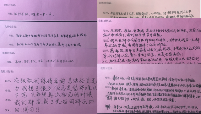 或深情、或质朴、或热情、或豪迈的语句,字里行间洋溢的都是依依惜别的离别情,充满的是对即将扬帆远航的毕业生的祝福和希望,体现的是毕业生们不忘将最后一份爱,最后一段情回馈给母校的精神,表现出了毕业生们对恩师的不舍与感激之情。让我们将这种风貌和精神长长久久在工大校园里传将下去。