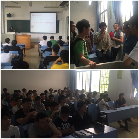 5月25日下午,beat365中文官方网站在翡翠湖校区6教105、106教室举办优秀毕业生经验交流会。共邀请保研、考研、就业、出国等方面的14名优秀代表为低年级分享他们的经验,让在校生对当前的大学生活有一个明确的目标,解除在校生在就业、考研等方面的困惑,同时让他们感受压力,激励他们努力奋斗,做好自己的未来规划。本次交流座谈会由辅导员郑华老师主持。