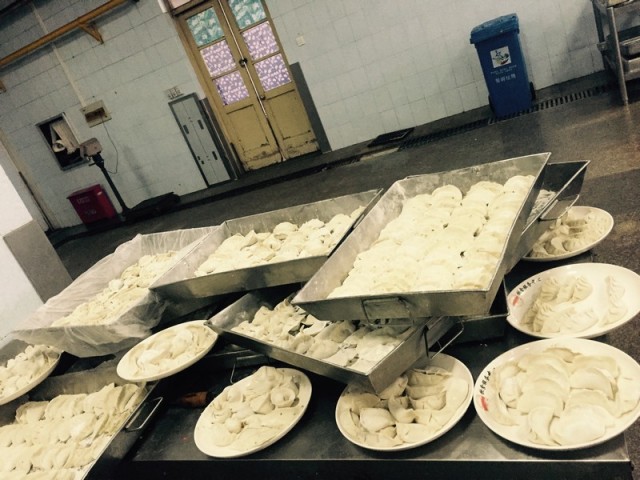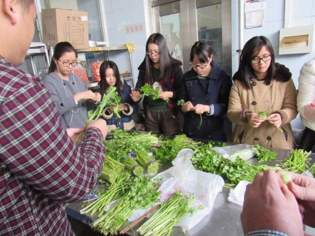 上午,辅导员郑华老师和几名学生会成员精心购买了饺子所用的食材,下午女同学们早早来到食堂后厨,亲自动手摘菜、洗菜,食堂师傅也热情地帮忙切菜、拌馅。经过一番前期准备,一盆盆的猪肉白菜馅儿、猪肉芹菜馅儿、猪肉香菇馅儿摆上了餐桌,同学们都跃跃欲试,准备好一展身手。北方的同学包饺子手艺精湛,而南方的同学多数没有自己动手包过饺子,于是北方同学自觉充当起了现场师傅,指导大家如何包出好看的饺子。大家也充分发挥自己的动手能力和想象力,新款式、新技巧层出不穷,把这场本来纯粹包饺子的活动变成了一场创意手工制作大赛。