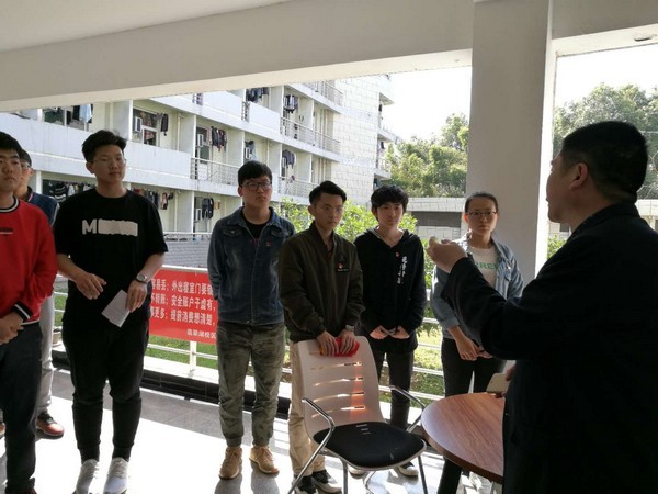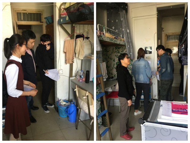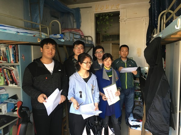 在学院党委副书记张炳武老师的带领下,检查人员来到学生6号宿舍。张书记首先对参与本次安全卫生检查的师生党员进行了小组分工,共设3个检查小组,每组由1-2名教工党员带队,物业人员和学生党员4-5名组成。他希望检查人员可以深入寝室,了解学生在寝室的生活状态,能够及时发现学生寝室存在的不卫生、不文明、不安全的问题和隐患,并详细记录提出相应整改要求。