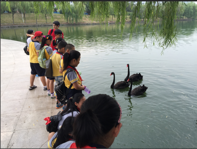 首先,志愿者们带领小朋友们来到了东风广场。在这里,他们三五成群的游戏,还和可爱的黑天鹅玩耍,小朋友们高兴极了,充满欢笑。