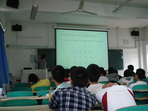 讲座刚开始,技术部谢浩哲便向同学们讲述了“何为编程之美”:我们可以通过计算机的编程,优雅、快速的解决实际中看似艰难的问题,并且计算机无怨无悔执行任务。之后谢部长还让大家思考题目,同学们也积极的参与其中。