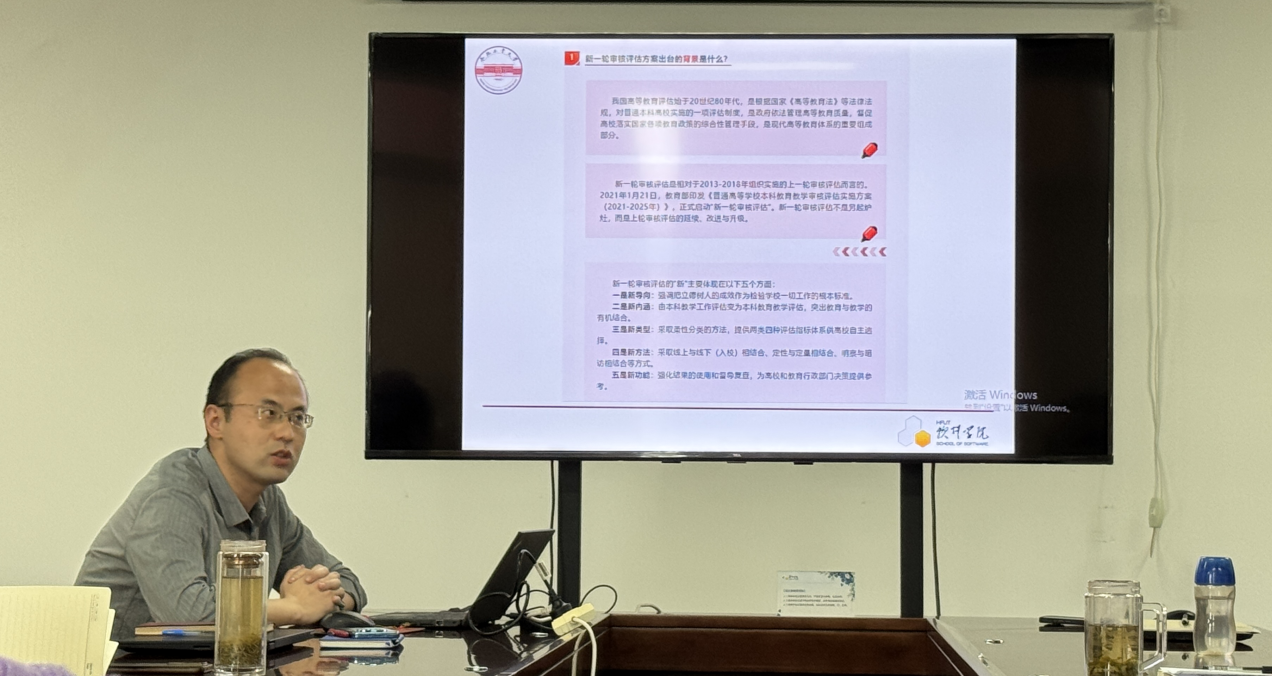 系副主任张高峰向全体老师解读、领学了本科教育教学审核评估的基本知识,他从审核评估的背景、意义、指导思想、基本原则,以及我校参加第一类评估的重点内容等方面进行了系统讲解,使老师们对审核评估有了基本的认识。